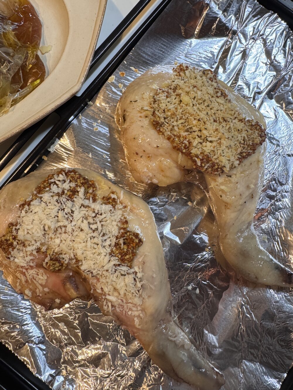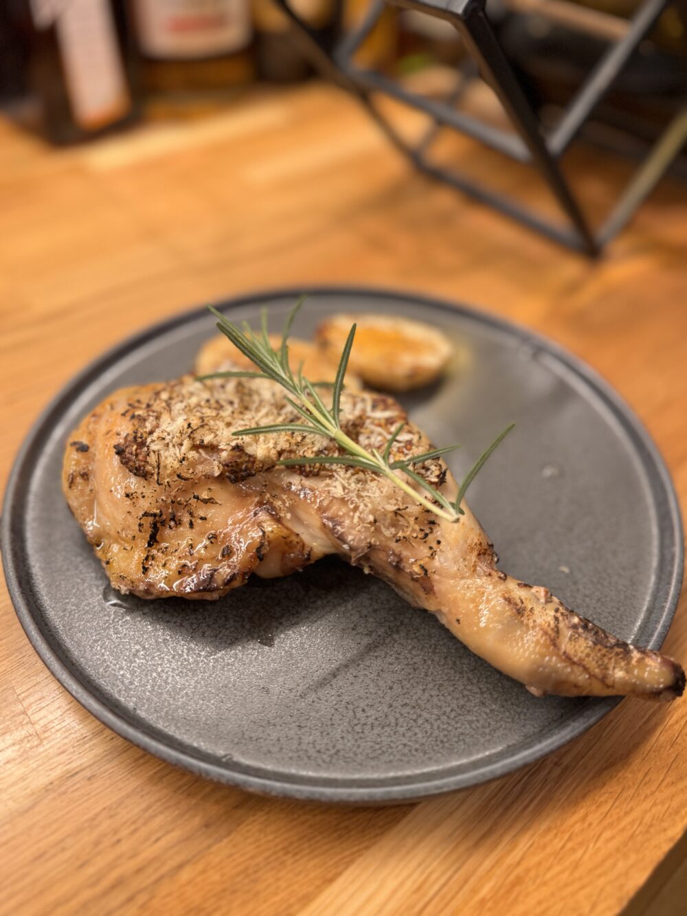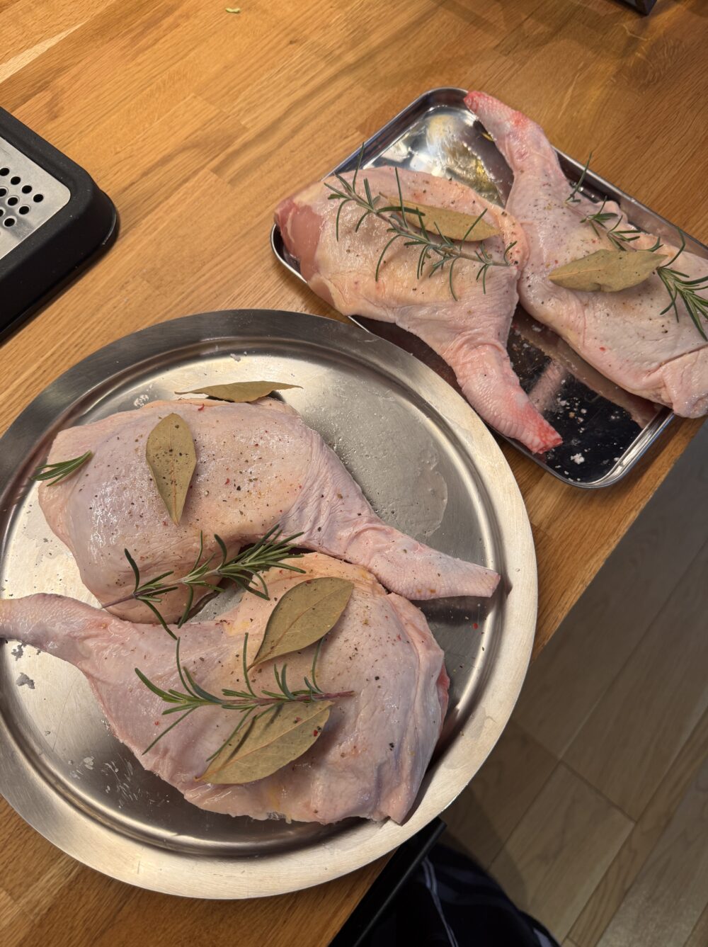 鶏の総量に対して1%の塩、ハーブ、ニンニク、白胡椒で半日〜1日マリネ