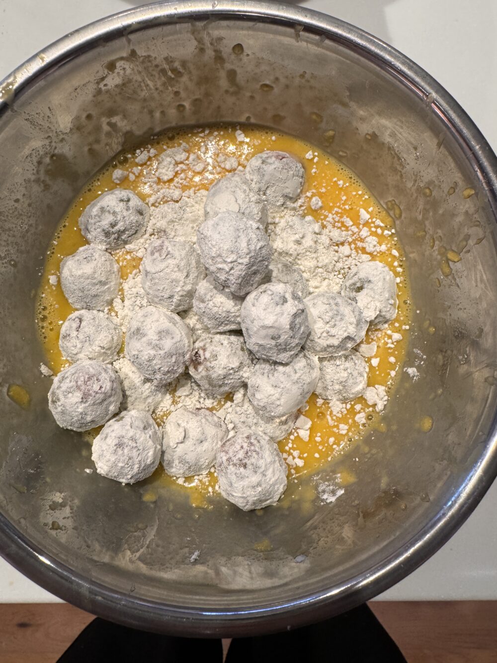 ボールに入れてコロコロ転がして小麦粉をつけます